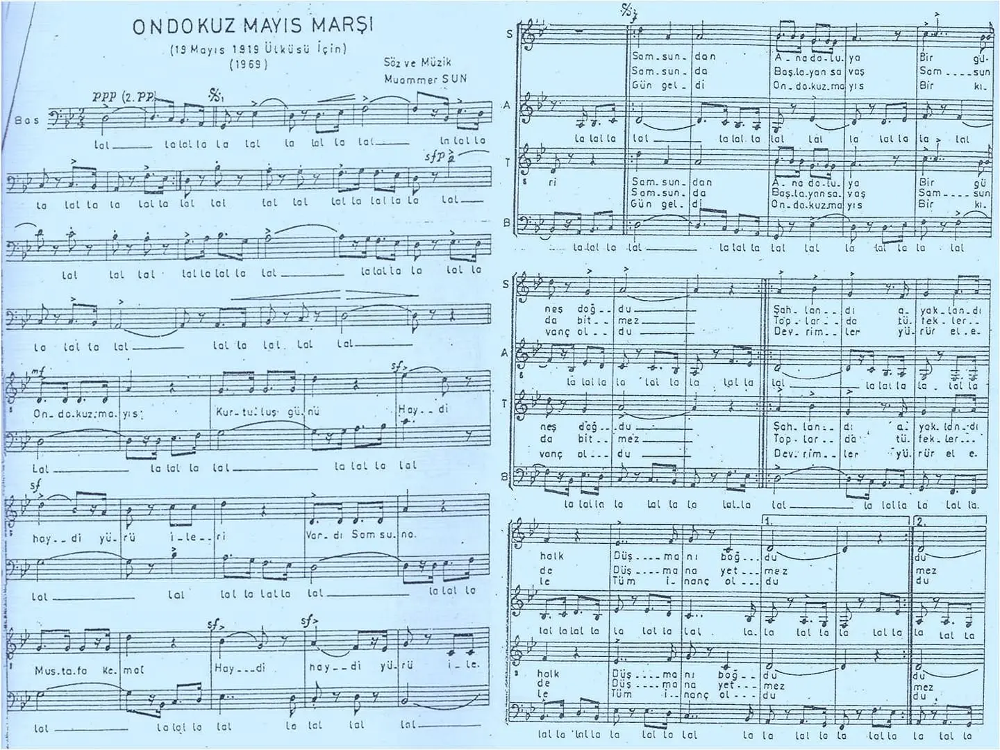 Değerli öğretmenimize bu büyük eserinden dolayı bin teşekkür ediyoruz. Aynı yıl TRT’deki görevi sırasında TRT Çoksesli koroların kurulmasını sağladı ve bu sayede sınıfımızdan birkaç arkadaşımız orada görev aldı. Onlardan biri olan Mustafa Apaydın bu yıl 17.korolar şenliğini düzenlemekte olan Polifonik Korolar Derneğinin kurucusu ve başkanıdır. 1969’da Muammer Sun’un öğrencisi olmak ve onun bu eserini ilk söyleyen sınıf olmanın heyecanıyla her birimiz korolarımıza ve sınıflarımıza yıllarca bu eseri öğrettik, 19 Mayıs bayram törenlerinde öğrencilerimizle birlikte söyledik.
