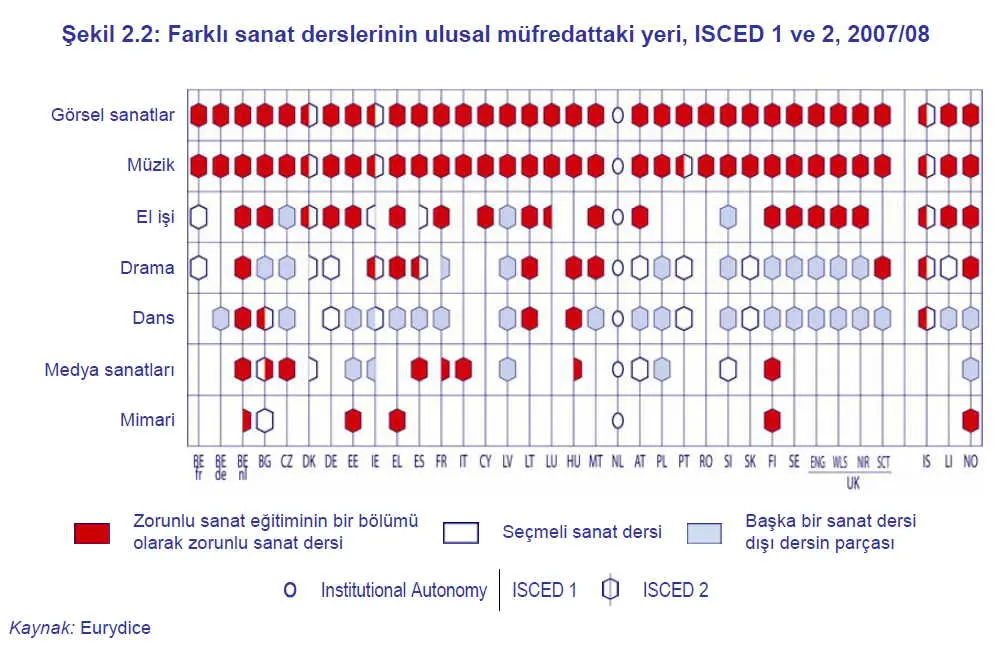İlköğretim seviyesinde ise, dil öğretimi, matematik, fen bilimleri ve sosyal bilimler derslerinden sanat eğitimi derslerinin saati düşüktür, fakat ülkelerin büyük bir çoğunluğunda sanat eğitimine yabancı dil öğretimi ve beden eğitimi derslerinden daha fazla zaman ayrılmaktadır. Ne var ki, alt ortaöğretim seviyesinde, sanat konularına ayrılan ders saatinin diğer konu alanlarıyla karşılaştırıldığında azaldığı görülmektedir.