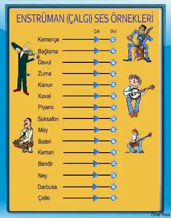 Yıllar önce yaptığım bir Flash uygulamasıdır. Daha önce paylaşmıştım ama ben de sitede bulamadım. 🙂 Ortaokulda görevliyken öğrencilerle yarışma düzenliyordum üst sınıflarda ve “kaç tane çalgıyı sesinden tanıyorsunuz?” sorusuna verilen cevaplar beni şaşırtıyordu. Aşağıdaki görselde hangi çalgıların sesleri olduğunu görebilirsiniz. Akıllı tahtalarda kullanabilirsiniz.