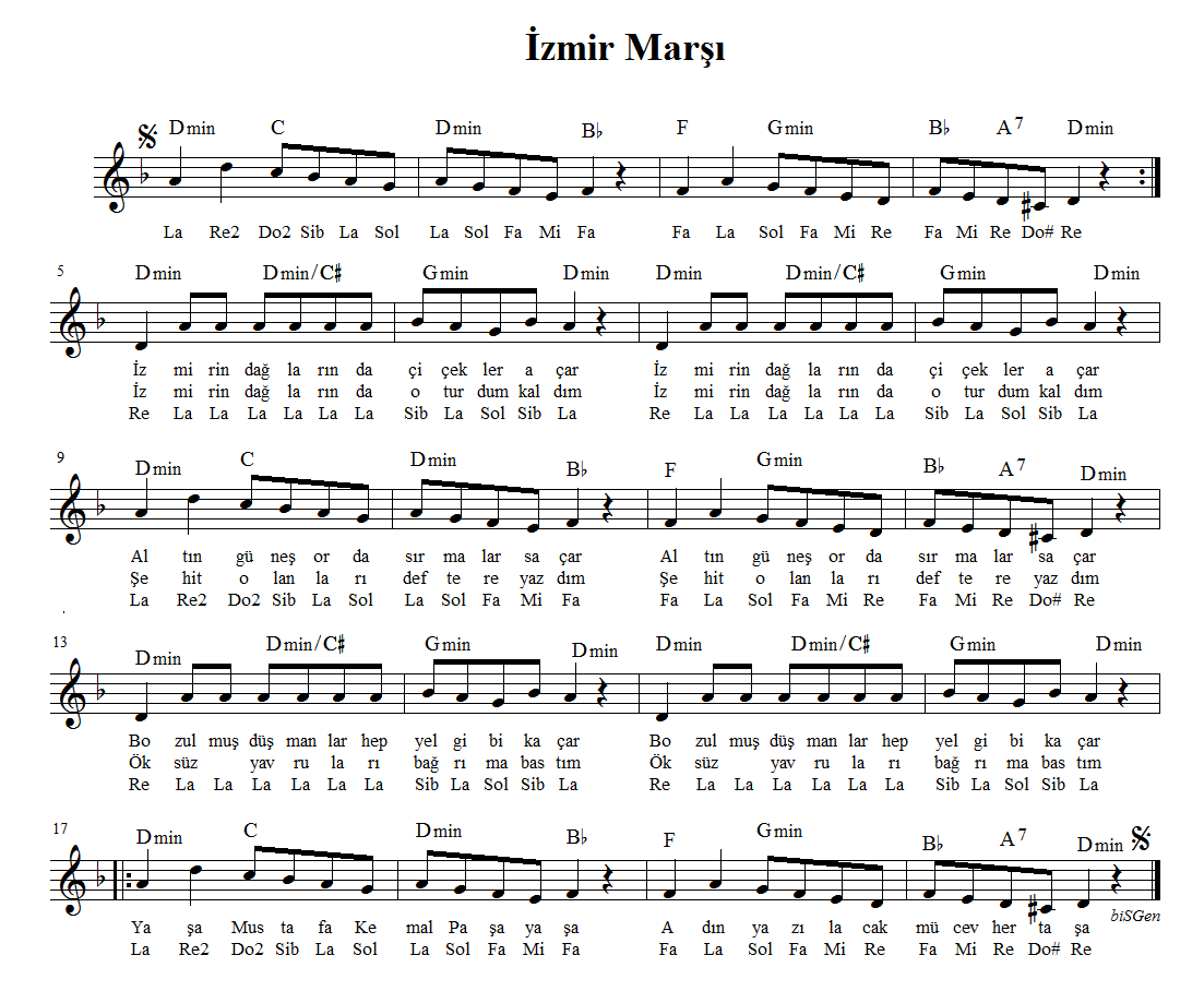 Ayrıca BURADAN ve BURADAN İzmir Marşı altyapılarını indirebilir, BURADAN marşın sözlü haline bakabilir ve BURADAN Özce Tüfekçi arkadaşımızın okul korolarında seslendirmek için yaptığı altyapıya bakabilirsiniz. Notalar için sevgili Bişgen’in yaptığı görseli aşağıda inceleyebilirsiniz.