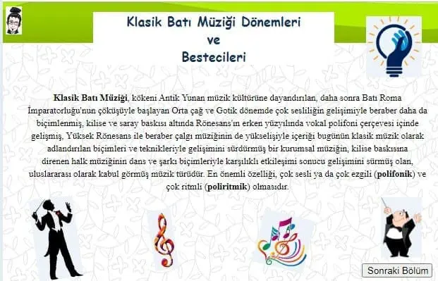 Klasik Batı Müziği Dönem ve Bestecileri ile ilgili M.Yusuf Bişgen’in yaptığı interaktif uygulamadır. Paylaşımı ve emeği için teşekkür ediyorum. Uygulamaya gidebilirsiniz.