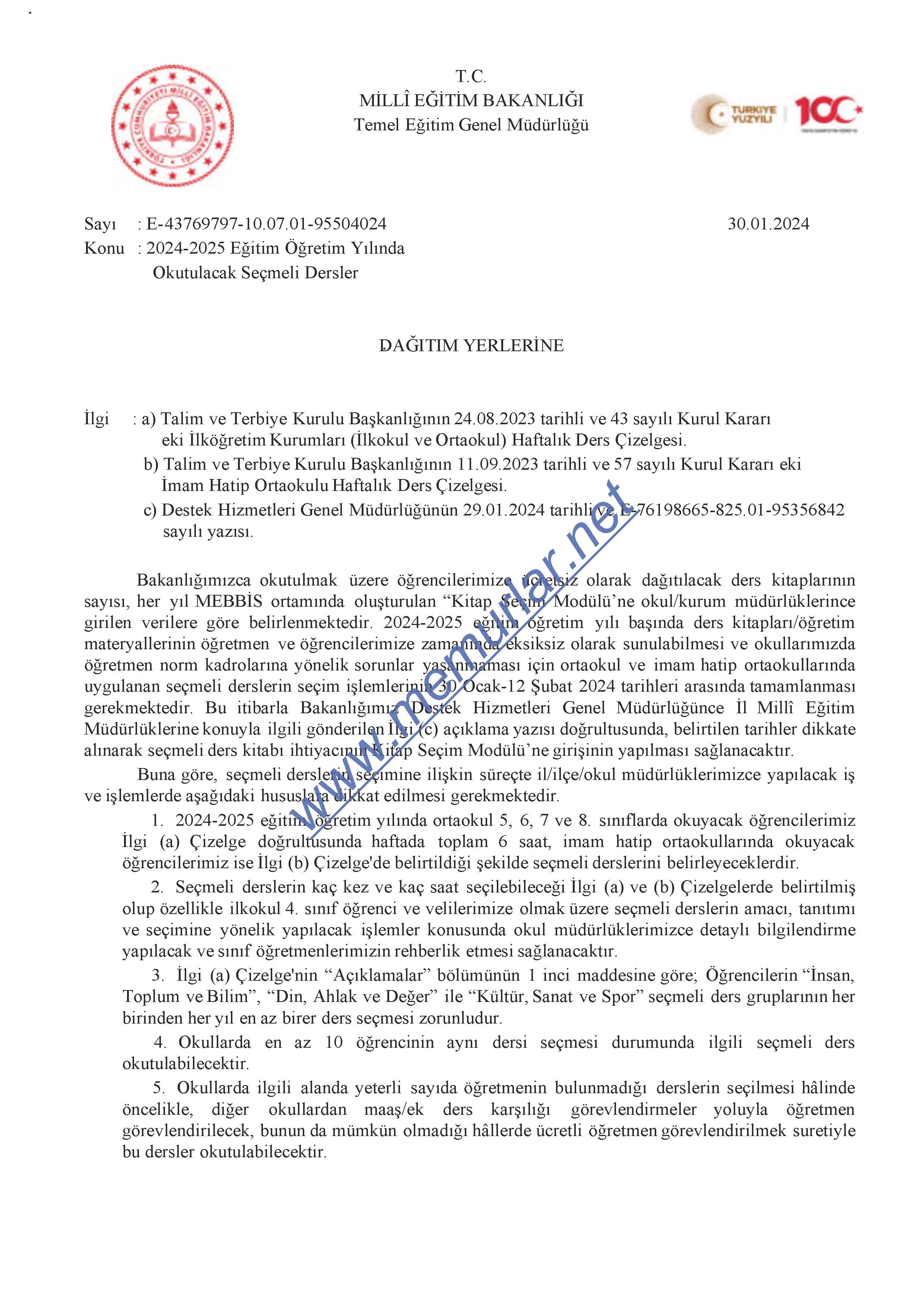 Bakanlığımızca okutulmak üzere öğrencilerimize ücretsiz olarak dağıtılacak ders kitaplarının sayısı, her yıl MEBBİS ortamında oluşturulan “Kitap Seçim Modülü’ne okul/kurum müdürlüklerince girilen verilere göre belirlenmektedir. 2024-2025 eğitim öğretim yılı başında ders kitapları/öğretim materyallerinin öğretmen ve öğrencilerimize zamanında eksiksiz olarak sunulabilmesi ve okullarımızda öğretmen norm kadrolarına yönelik sorunlar yaşanmaması için ortaokul ve imam hatip ortaokullarında uygulanan seçmeli derslerin seçim işlemlerinin 30 Ocak-12 Şubat 2024 tarihleri arasında tamamlanması gerekmektedir. Bu itibarla Bakanlığımız Destek Hizmetleri Genel Müdürlüğünce İl Milli Eğitim Müdürlüklerine konuyla ilgili gönderilen Destek Hizmetleri Genel Müdürlüğünün 29.01.2024 tarihli ve E-76198665-825.01-95356842 sayılı yazısı doğrultusunda, belirtilen tarihler dikkate alınarak seçmeli ders kitabı ihtiyacının Kitap Seçim Modülü’ne girişinin yapılması sağlanacaktır.
