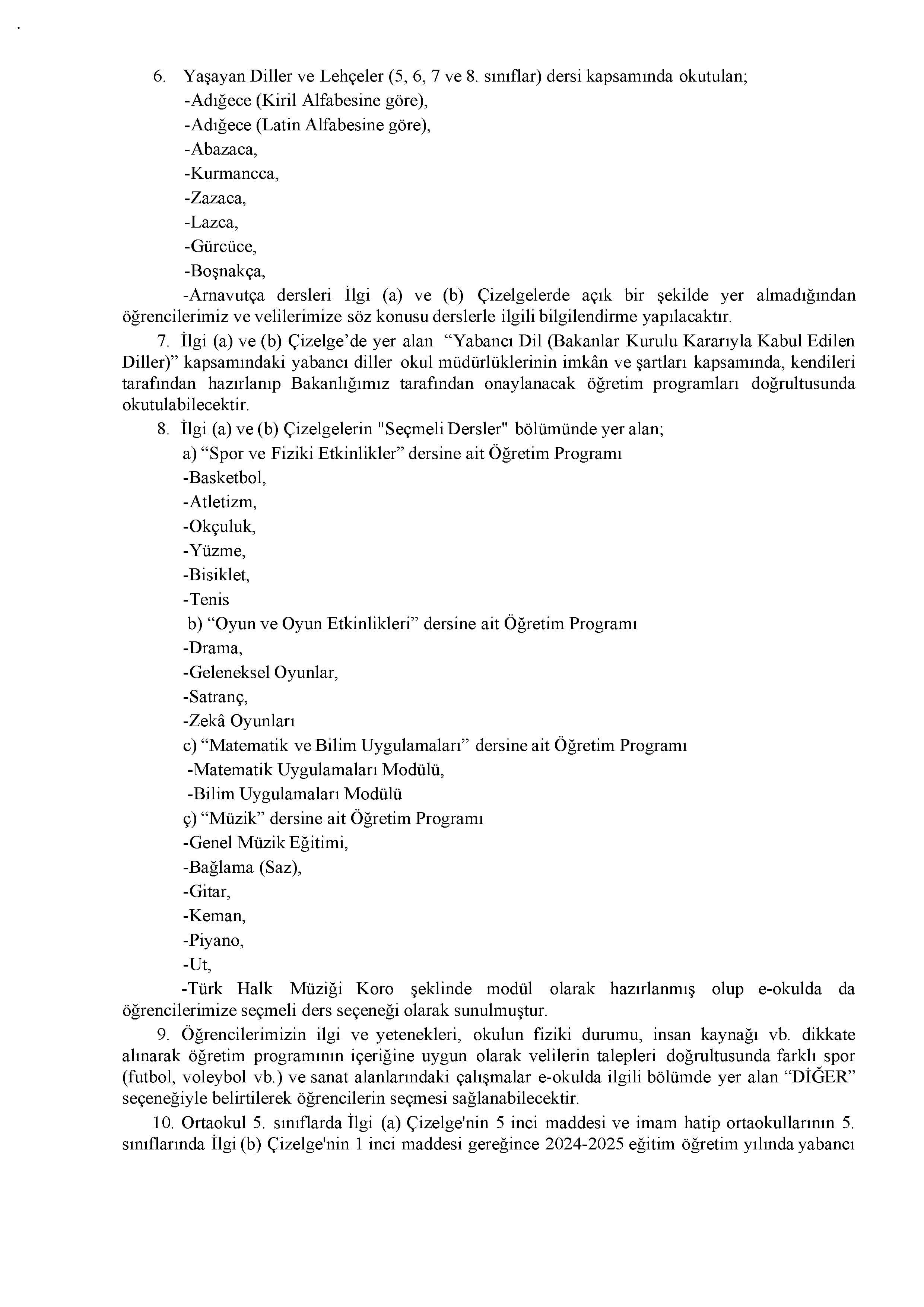 1. 2024-2025 eğitim öğretim yılında ortaokul 5, 6, 7 ve 8. sınıflarda okuyacak öğrencilerimiz İlgi (a) Çizelge doğrultusunda haftada toplam 6 saat, imam hatip ortaokullarında okuyacak öğrencilerimiz ise İlgi (b) Çizelge’de belirtildiği şekilde seçmeli derslerini belirleyeceklerdir.