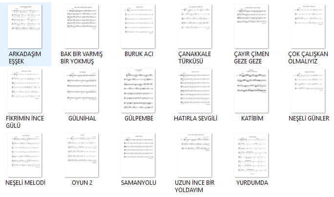 Fatih Alkaya hocamızın hazırladığı melodika için şarkılar dosyasında aşağıdaki görselde gördüğünüz eserler vardır. Çoook teşekkür ediyorum.
