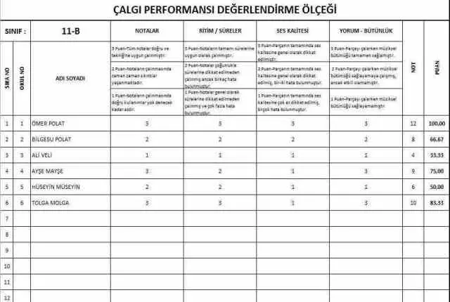 Müzik Dersi performansı değerlendirme için kullanabileceğiniz Excel ile oluşturulmuş belgedir. Çizelgeyi internetten buldum ve üzerinde bazı değişiklikler yaptım. Olumsuzdan-Olumluya 1-2-3 şeklinde puan verildiğinde not otomatik oluşsun istedim. Ayrıca verilen kriterleri ayırarak üç ayrı sütün şekline çevirdim. Böylelikle sadece çalgı için değil, siz hangi kazanımı değerlendirmek istiyorsanız kolaylıkla belgeyi değiştirebilecekseniz. Umarım işe yarar.