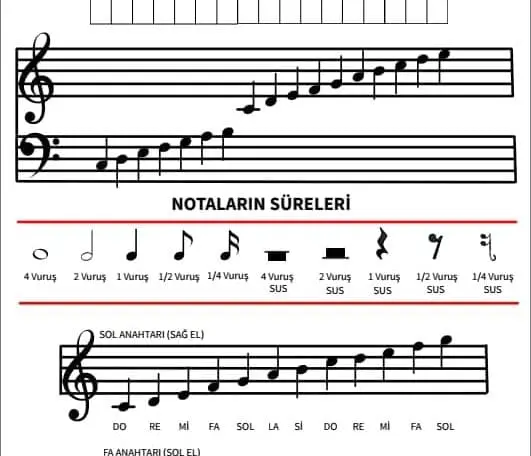 Piyano notasyon, Piyano öğretiminde kullanabileceğiniz örnek bir PDF belgesi. Notaların yerleri ve süreleri konusunda yardımcı olacaktır. Aşağıda örneği görebilir ve indirebilirsiniz.